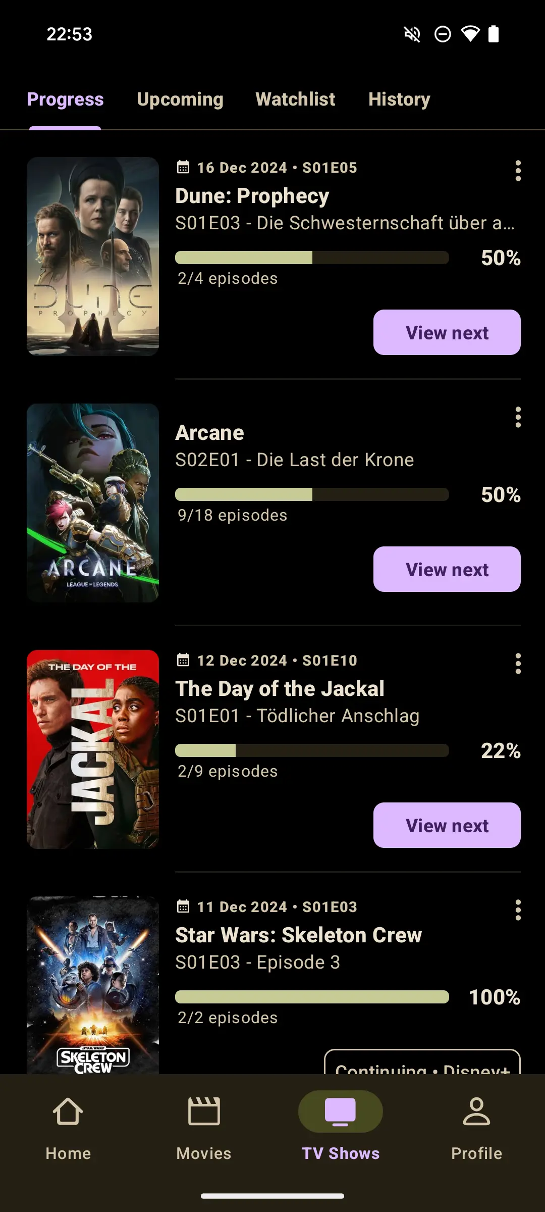 Track watched episodes and view your progress. Sync seamlessly with Moviebase Cloud or Trakt for real-time updates across devices.